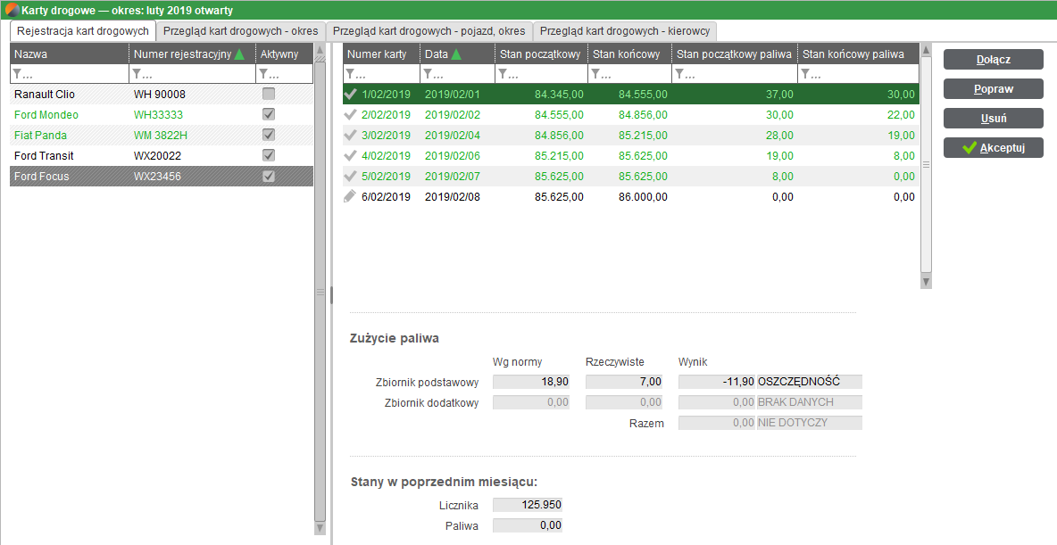 W obszarze Karty drogowe można przeglądać, rejestrować i modyfikować dane pojazdów oraz karty drogowe dla każdego z pojazdów. Do karty drogowej można przypisać pracowników wykonujących kurs i powiązać karty drogowe z kartami pracy. Przełożony może akceptować karty drogowe. W systemie można rejestrować stan licznika pojazdu oraz normy paliwowe pojazdów.