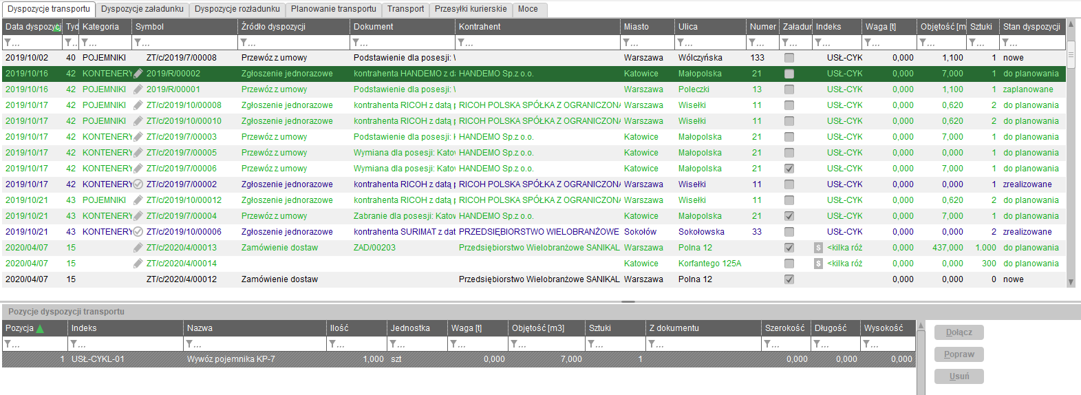 Na podstawie wystawionych dyspozycji transportowych można zarejestrować i zaplanować transport.