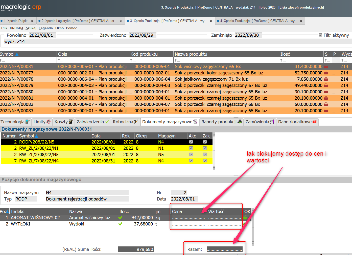 Jednym z nich jest ukrycie cen gotowych wyrobów, kosztów produkcji, w tym kosztów amortyzacji, kosztów zakupu surowców i kosztów osobowych na zleceniach produkcyjnych i kartach technologicznych. Dostęp do tych danych w systemie mają tylko wyznaczone osoby zajmujące się księgowością.