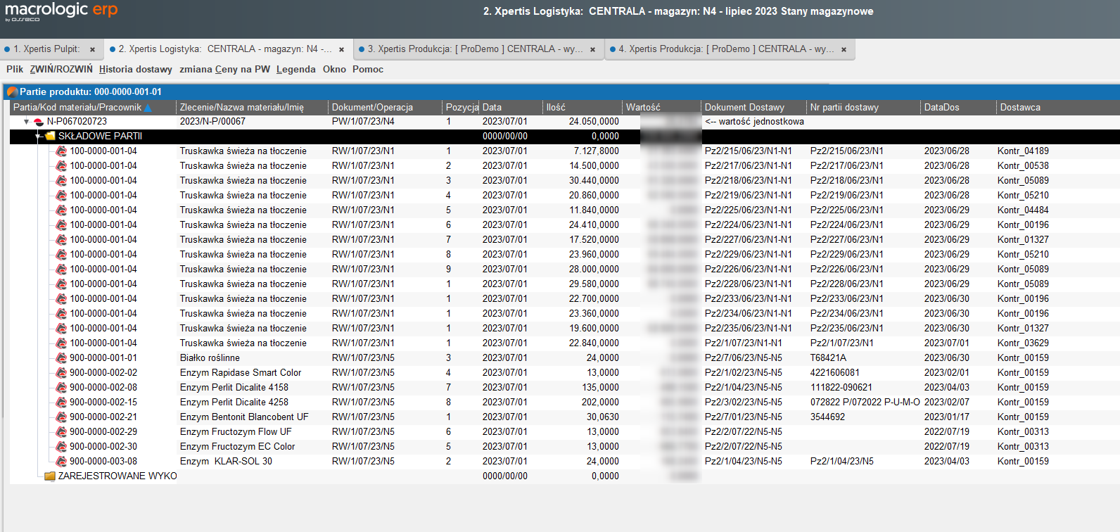 W branży przetwórstwa owoców i warzyw często odbywają się zewnętrzne kontrole prowadzone przez państwowe organy. System ERP jest w stanie szybko wskazać szczegółowe informacje na temat każdej wyprodukowanej partii. Służy temu akcja PARTIE, która prezentuje niezbędne informacje, w tym między innymi lokalizację sadów, z których pochodzą owoce czy wagę surowca zużytego do produkcji 1 kg wyrobu gotowego.