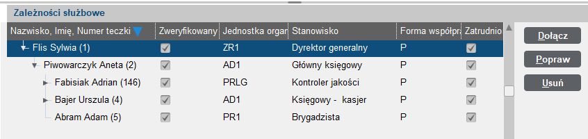 Podczas przechodzenia osoby między komórkami organizacyjnymi/stanowiskami struktura zależności służbowych nie zmieni się automatycznie. System wyłapuje jednak sytuacje, że coś się zmieniło i sygnalizuje, że należy zweryfikować aktualną strukturę zależności służbowych.