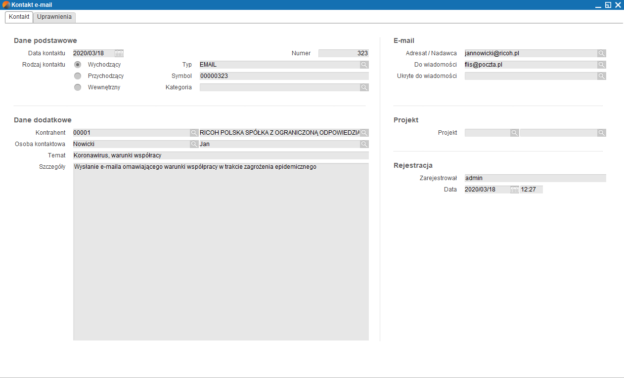 W systemie można ewidencjonować dane kontrahentów (adresy, telefony, e-maile itd.) oraz różnorodne kontakty z nimi (spotkania, rozmowy telefoniczne, korespondencję itp.). Dostęp do danych o relacjach z kontrahentami można nadać tylko niektórym użytkownikom systemu. (Jeżeli nie zostaną ograniczone uprawnienia, wszyscy użytkownicy będą mieli dostęp do informacji o kontaktach).