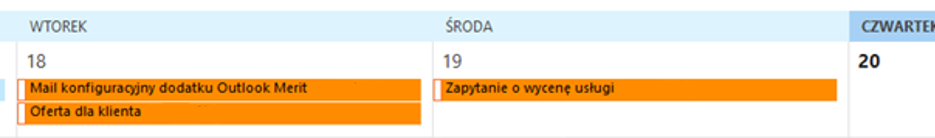 Dodatek Outlook Merit pobiera w 5-minutowym interwale czasowym listę powiadomień dla operatora systemu Outlook i zapisuje je w kalendarzu. Przypomnienie zawiera tytuł oraz treść.